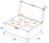 | Maximum load: | 50 kg | | Aluminum profile frames: | 22 mm | | Case handle: | 2 pc/pcs | | Stop hinge: | 2 pc/pcs | | Lock: | Butterfly lock: 1 pc/pcs | | Use of brands: | Branded hardware | | Material: | Birch multiplex, 6 mm, laminated | | Color: | Dark brown | | Device compartment: | 18 cm x 18.5 cm x 23 cm | | Accessory compartment: | 10 cm x 40 cm x 24 cm | | Dimensions: | Width: 52 cm Depth: 43 cm Height: 30 cm | | Weight: | 8.70 kg |