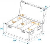 |  | Trunk case with castors, PRO version | Maximum load: | 100 kg | | Aluminum profile frames: | 25 mm | | Case handle: | 4 pc/pcs | | Stop hinge: | 2 pc/pcs | | Lock: | Butterfly lock: 2 pc/pcs | | Transport aid: | 4 x castors with 2 locking brakes | | Use of brands: | PENN Hardware | | Material: | Birch multiplex, 9 mm | | Color: | Black, laminated | | Device compartment: | 12 cm x 50 cm x 26 cm | | Accessory compartment: | 9 cm x 52 cm x 28 cm | | Dimensions: | Width: 89 cm Depth: 56 cm Height: 47 cm | | Weight: | 18.65 kg |