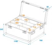 |  | Trunk case, PRO version | Maximum load: | 100 kg | | Aluminum profile frames: | 30 mm | | Case handle: | 4 pc/pcs | | Stop hinge: | 7 pc/pcs | | Lock: | Butterfly lock: 2 pc/pcs | | Use of brands: | PENN Hardware | | Material: | Birch multiplex, 9 mm | | Color: | Black, laminated | | Device compartment: | 99.5 cm x 12 cm x 26 cm | | Accessory compartment: | 10 cm x 71 cm x 28 cm | | Dimensions: | Width: 116 cm Depth: 75 cm Height: 32.5 cm | | Weight: | 24.20 kg |     |  |  |  | |