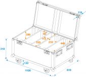 | Maximum load: | 100 kg | | Aluminum profile frames: | 30 mm | | Case handle: | 4 pc/pcs | | Stop hinge: | 4 pc/pcs | | Lock: | Butterfly lock: 2 pc/pcs | | Transport aid: | 4 x castors with 2 locking brakes | | Use of brands: | Branded hardware | | Material: | Birch multiplex, 9.8 mm; birch multiplex | | Color: | Black, laminated; dark brown, laminated | | Device compartment: | 21.5 cm x 55.5 cm x 28 cm | | Accessory compartment: | 11.5 cm x 53.5 cm x 28 cm | | Inside dimensions: | 105.5 cm x 56 cm x 37 cm | | Dimensions: | Width: 110 cm Depth: 61 cm Height: 53 cm | | Weight: | 35.35 kg |     |  |  |  | |