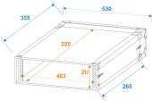 | Maximum load: | 10 kg | | Aluminum profile frames: | 30 mm | | Carrying handle: | 1 pc/pcs | | Lock: | Spring lock: 4 pc/pcs | | Transport aid: | 4 x rubber feet | | Use of brands: | Branded hardware | | Material: | Birch multiplex, 9 mm; plywood multi-layer glued | | Color: | Black, laminated; dark brown, laminated | | Front panel width: | 19" | | Mounting height: | Approx. 9 cm (2 U) | | Mounting depth: | 265 mm | | Housing design: | 2 U | | Dimensions: | Width: 54 cm Depth: 41 cm Height: 11.5 cm | | Weight: | 5.20 kg |