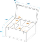 | Maximum load: | 25 kg | | Aluminum profile frames: | 12 mm | | Carrying handle: | 1 pc/pcs | | Stop hinge: | 3 pc/pcs | | Lock: | Spring lock: 2 pc/pcs with shut-off function | | Material: | Plastic, 3 mm | | Color: | Black, imprinted | | Inside dimensions: | 52 cm x 28.5 cm x 20 cm | | Dimensions: | Width: 54 cm Depth: 31 cm Height: 26 cm | | Weight: | 3.45 kg |