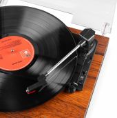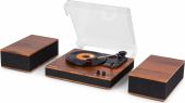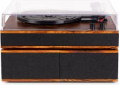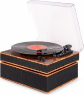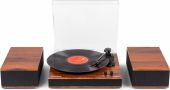 | Product colour | Wood | | Playback options | BT streaming, Vinyl | | Speed settings (RPM) | 33, 45, 78 | | Output power | 120W | | Power supply | 100-240VAC 50/60Hz (12V Adapter) | | Dimensions (L x W x H) | 315 x 330 x 105mm (Record player) 288 x 165 x 100mm (Speaker) | | Weight (kg) | 4,60 | | Included accessories | Adapter for singles, Power adapter |
