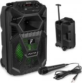 The FPC8T portable party speaker packs sound performance into a compact, lightweight housing with telescopic handle and wheels that makes music on the go easier. Simply pair it with your smartphone, use a MicroSD card/USB driver or hook up a 3.5mm audio cable to your device when wireless connection isn’t available. The built-in colourful disco light mounted in the grill adds an amazing effect to any party. Run this party speaker from the mains or take it anywhere with the rechargeable built-in battery. Connect the included microphone and sing along!