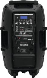 | Power supply: | 230 V AC, 50 Hz Or 12V DC | | Power consumption: | 75 W | | Protection class: | Protection class I | | Output power: | Max. 90 W 45 W RMS | | Power connection: | Mains input via IEC connector (M) mounting version power supply cord with safety plug (provided) Battery/battery pack (optional) Mains input via spring terminal | | Device fuse: | 5 x 20 mm, T 1 A fuse replaceable | | Frequency range: | 62 - 18000 Hz | | Sensitivity: | 90 dB (1W/1m) | | Max. SPL: | 109 dB | | Control: | Bluetooth | | Bluetooth device name: | OMNITRONIC | | Frequency stability: | ± 0.005 % | | Frequency selection: | Fixed frequencies | | Attachment system: | Flange: Ø 35mm | | Control elements: | Power switch, Master control, level control per channel, echo effect control, tone control; audio player | | Status LED: | Power, charge status indicator, clip, microphone | | Connections: | Antenna via 2 x BNC (F) Input: microphone via 2 x 6.3 mm plug (unbal.) Input: line via 1 x stereo RCA Output: line via 2 x RCA (F) mounting version | | Equalizer: | Master: 1 x graphic equalizer 5-band stereo Centre frequency: 100Hz/330Hz/1.1kHz/3.3kHz/6.8kHz | | Speaker: | 1 x woofer 12" Basket material: steel Conematerial: cardboard/paper 1 x horn 1" | | Type of speaker: | Compact cabinet speaker | | Carrying handle: | 2 pc/pcs | | Transport aid: | Trolley | | Switch: | On/off switch | | Material: | Plastic | | Color: | Black | | Dimensions: | Width: 36 cm Depth: 32 cm Height: 59 cm | | Weight: | 10.85 kg | | Microphone | | | Power supply: | 3V DC | | Power connection: | Battery/battery pack | | Capsule type: | Dynamic | | Polar pattern: | Cardioid | | Battery: | 2 x Mignon (AA) (not included) | | Range: | Range up to 30m | | Carrier frequency: | 830 MHz; 864 MHz | | RF power output: | 10 mW | | Dimensions: | Length: 25.0 cm Diameter: Ø 3.2 cm | | Weight: | 0.17 kg | | Remote control | | | Battery: | 1 x button cell 3.0 V CR2025 lithium manganese built-in | | Audio player | | | Control: | IR remote control | | Audio player: | USB + SD + Bluetooth | | Range: | Bluetooth: range up to 10m | | Frequency band: | 2.4 GHz | | Music format: | MP3, WMA | | Available storage media: | USB devices/SD cards max. 32GB (FAT 32) | | Battery pack | | | Battery pack type: | 1 x lead 12 V, 7000 mAh, 84 Wh | | Battery pack: | Battery operation up to 5h Recharging time 11h |