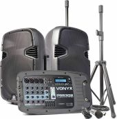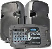 |  | This 2-way portable sound set consists of 2x 10" passive speakers, the backside of one has a detachable powered mixer and the other has a storage compartment. This sound set uses a class-D amplifier. The mixer has 8 input channels for 4 microphone connectors, channels 5/6 and 7/8 have stereo inputs for connecting your MP3 player, CD player or musical instrument. Equipped with BT for audio streaming, USB port and SD slot with MP3 control panel and is equipped with an equalizer and many effects to give music and/or voice a nicer sound. Including wired microphone and 2 speaker stands to complete the system. - High quality wired microphone and speaker stands included