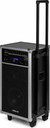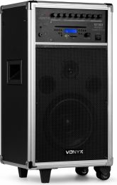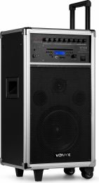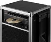 An 8'' professional portable sound system with BT-receiver for audio streaming and slot-in CD/MP3 with antishock. This sound system with built-in 250W amplifier and battery in a mobile housing is perfect for (karaoke) parties. Supplied with 1 wired microphone, 2 wireless UHF handheld microphones, remote control, telescopic handle and wheels. Easy moveable and can be used everywhere even if there is no mains power present. Ideal for schools, gymnasiums, dance, camping, karaoke parties etcetera.