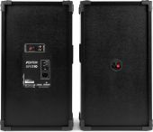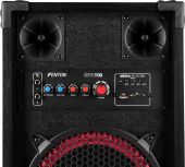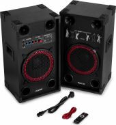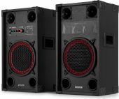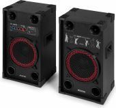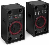 | Product colour | Black | | Speaker type | Active (amplified) | | Output power: Max | 600W | | Output power | 300W | | Tweeter type | Piezo | | Diameter woofer | 10" | | Magnet type | Ferrite | | SPL max | 123dB | | Frequency response | 40Hz - 20.000Hz | | Impedance | 8 Ohm | | Playback options | BT streaming, USB, SD, Line input, Microphone (input) | | Input connections | 6.3mm Jack, RCA, SD, USB | | Dimensions: Per speaker | 270 x 330 x 583mm | | Weight (kg) | 12,49 | | Included accessories | Power cable, Speaker cable |