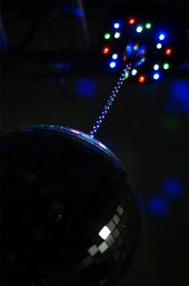 En batteridrevet lav-støymotor for speilballer opptil 2 kg, utstyrt med 18 fargede LED-lys. Spesielt i mørket gir dette en fantastisk effekt. Kan brukes som selvstendig enhet eller aktivert av lyd.