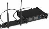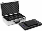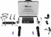 This set comes with a UHF 2 channels receiver, two handheld microphones with rechargeable Li-ion battery, two removable BNC antennas, two extender cables for front-mounting the antennas, a power adapter and an aluminium case. USB cables for charging the wireless microphones are also included. - Professional UHF wireless microphone system
