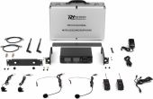 This set comes with a UHF 2 channels receiver, four bodypack transmitters with rechargeable Li-ion battery, two skin colour headsets, two tie-clip microphones, two removable BNC antennas, two extender cables for front-mounting the antennas, a power adapter and an Aluminium case. USB cables for charging the wireless microphones are also included.
