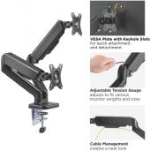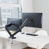 MAD-G-serien Gassfjær Monitor Armer er kraftige i utseende og robuste i ytelse. Med en fingerberøring gir den høykvalitets gassfjær-mekanismen enkel bevegelse av monitorarmen, inkludert opp, ned, utvidelse og tilbaketrekning for å oppnå den beste ergonomiske posisjonen. Den praktiske VESA-platen med nøkkelhullspor gjør det enkelt å montere eller fjerne skjermen. Skrivebordsklemmen og gjennomhullsmontasjebolt er inkludert. Kabelhåndtering langs armen holder arbeidsområdet rent og ledninger organisert. VESA-kompatibel med 75x75 og 100x100.