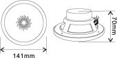 IP classification: | IP44 | Power: | Program: 30W Rated: 20W RMS | Frequency range: | 155 - 20000 Hz | Sensitivity: | 88 dB | Impedance: | 8 ohms | Connections: | Solder tail | Speaker: | 1 x woofer 4" Compression tweeter highs 1" | Type of speaker: | Flush-mount speaker; Coaxial speaker | Mounting dimensions: | Ø 12 cm | Mounting depth: | 53 mm | Dimensions: | Width: 14,1 cm Depth: 7 cm Height: 14,1 cm | Weight: | 510 g |