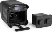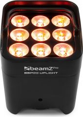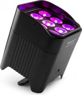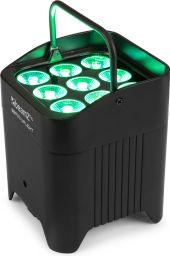 | Product colour | Black | | Light source | 6-in-1 LED | | Colours | Red, Green, Blue, Amber, White, Ultra Violet | | LED power (single LED) | 12W | | Quantity of LEDs | 9 | | Illuminance | 6.390 lx @ 1m | | Beam angle | 28° | | Field angle | 48° | | Flash rate per second | 1 - 28Hz | | IP rating | IP65 | | DMX channels | 6, 12 | | DMX connection | Wireless DMX | | Wireless DMX protocol | Eazylink (15m indoor, 25m outdoor) | | Battery | 12.6V - 10.4Ah | | Power consumption | 0.553 - 0.235A | | Power supply | 100-240VAC 50/60Hz (12V Adapter) | | Power plug | External power supply | | Included accessories | Remote control (wireless), Power adapter | | Dimensions (L x W x H) | 131 x 131 x 163mm | | Weight (kg) | 3,20 | pdf