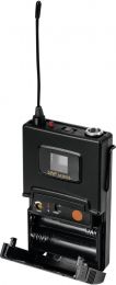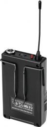 | Type: | Bodypack with microphone |  | Display type: | LCD display |  | Display: | Charge status indicator , channel |  | Weight: | 0.14 kg |  | Transmitter |  |  | Type: | Pocket transmitter |  | Power connection: | Battery/battery pack |  | Battery: | 2 x Mignon (AA) (not included) |  | S/N ratio: | >90 dB |  | THD: | <1 % at 1 kHz |  | Range: | Range up to 50m with line-of-sight |  | Frequency band: | UHF 823 - 832 MHz |  | Frequency stability: | ± 0.001 % |  | RF power output: | 5 mW (LO); 10 mW (HI) |  | Modulation: | FM |  | Frequency selection: | 100 switchable frequencies |  | Output voltage: | 5 V |  | Connections: | Input: microphone via mini XLR (M) 3-pin mounting version |  | Color code: | CH A= green, CH B= orange, |  | Switch: | On/off switch |  | Dimensions: | Width: 6.6 cm Depth: 2.2 cm Height: 10.8 cm |  | Microphone |  |  | Type: | Lavalier microphone |  | Power supply: | 2-10V DC |  | Cable length: | 1 m |  | Capsule type: | Electret Size: Ø 5.2 mm x 9.7 mm |  | Polar pattern: | Cardioid |  | Frequency range: | 50 - 15000 Hz |  | S/N ratio: | >63 dB |  | Sensitivity: | -47 dB |  | Impedance: | 680 Ohm |  | Connections: | Output: 1 x Mini XLR (F) 3-pin |                                                                       |