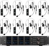 This set comes with a UHF 8 channels receiver, eight bodypack transmitters with rechargeable Li-ion battery, eight headsets, eight tie-clip microphones, two removable BNC antennas, two extender cables for front-mounting the antennas, a power adapter and an Aluminium case. Eight USB cables for charging the wireless microphones are also included. - Professional UHF wireless microphone system